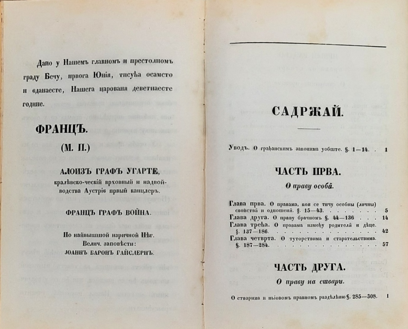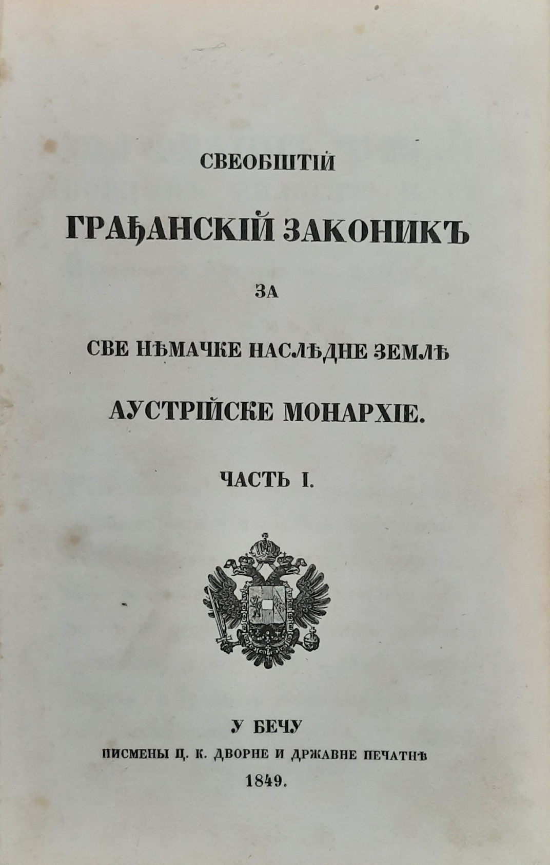„Sveopšti građanski zakonik za sve nasljedne zemlje Austrijske monarhije“, Beč 1849. godine, na srpskom jeziku i ćirilici